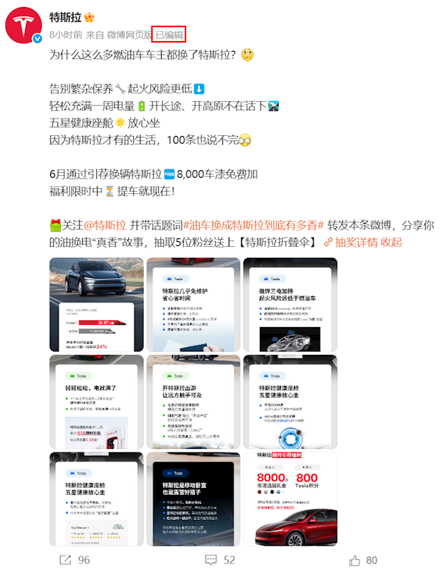 值得注意的是,特斯拉官方账号目前对上述海报已重新编辑发布,删除了加油成闷罐、上高原就熄火等相关描述。