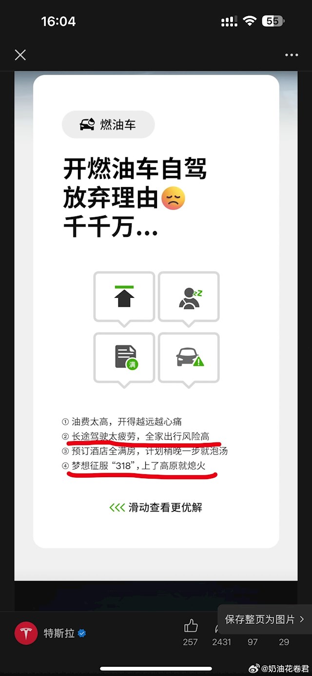 油车加油熄火成闷罐、上高原就熄火!特斯拉宣传海报遭吐槽